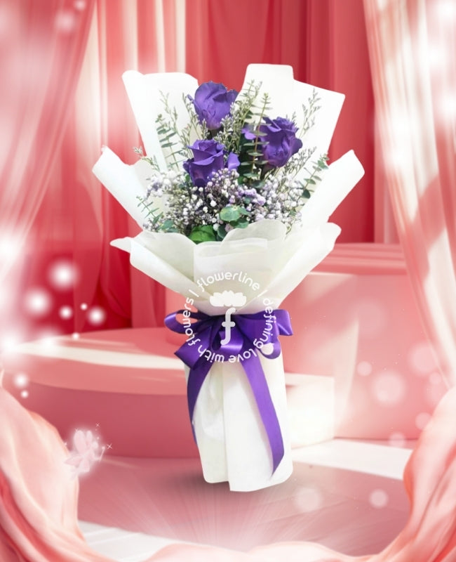 The bouquet comes with 3 stems of Painted Spray Bangkok Roses and fillers. The flowers are tied with nonwoven and waterproof paper wrappers plus a satin ribbon.