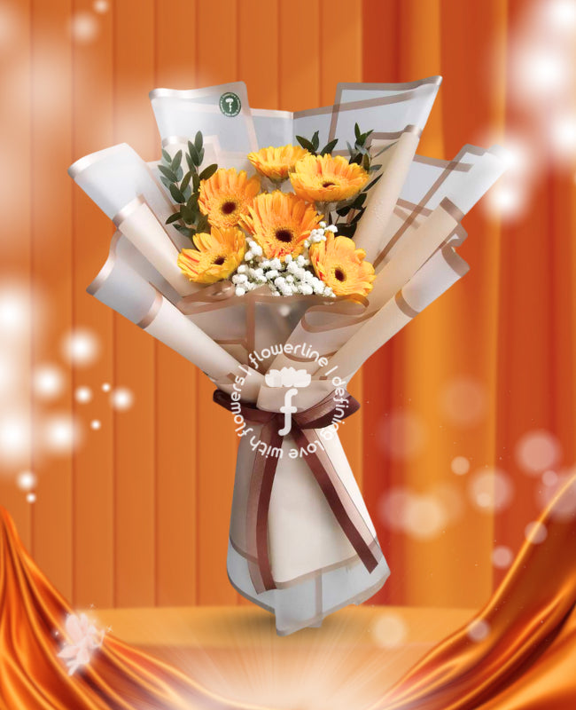 The bouquet comes with 6 stems of Gerberas and fillers. The flowers are tied with waterproof paper wrappers plus a satin ribbon.