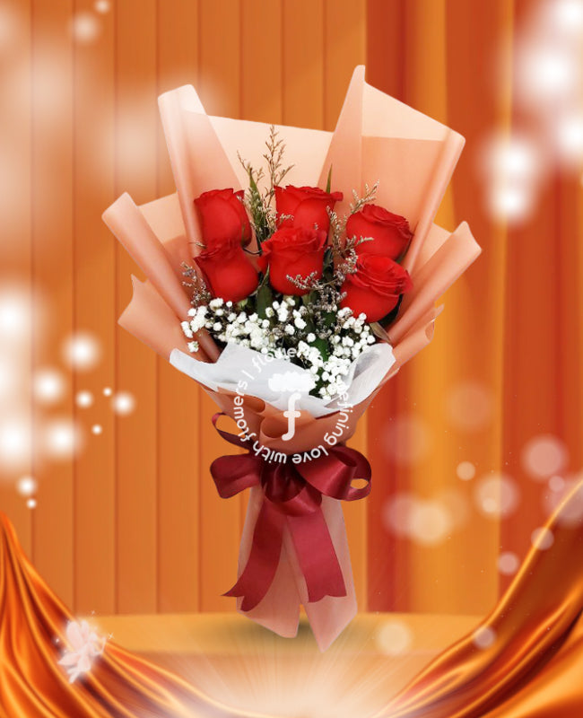 A bouquet with 6 stems of Bangkok Roses and fillers. The flowers are tied with nonwoven wrappers plus a satin ribbon.