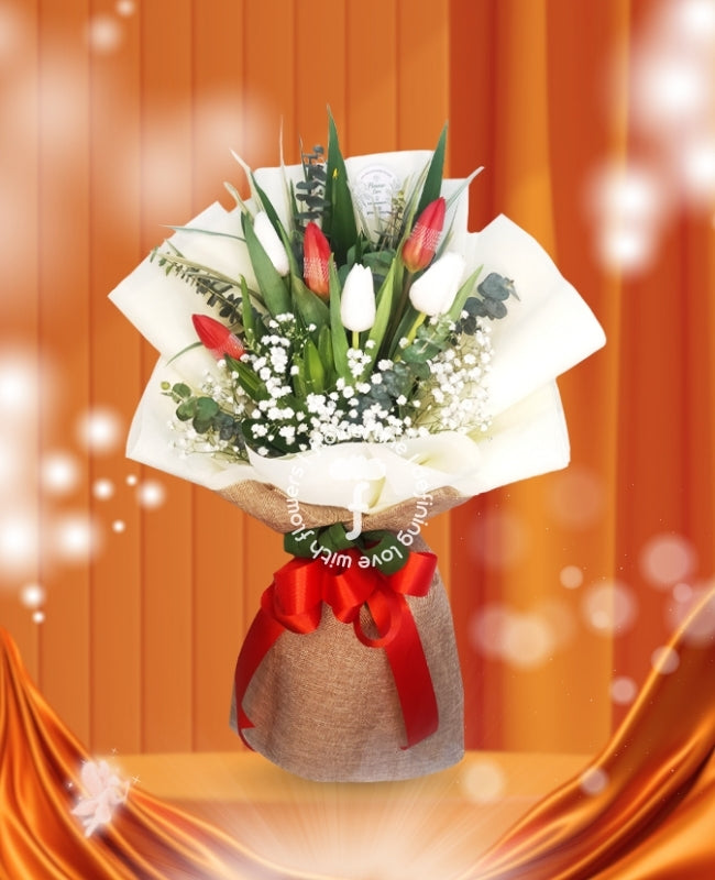 The bouquet comes with 6 stems of Tulips and fillers. The flowers are tied with nonwoven and waterproof paper wrappers plus satin ribbon.