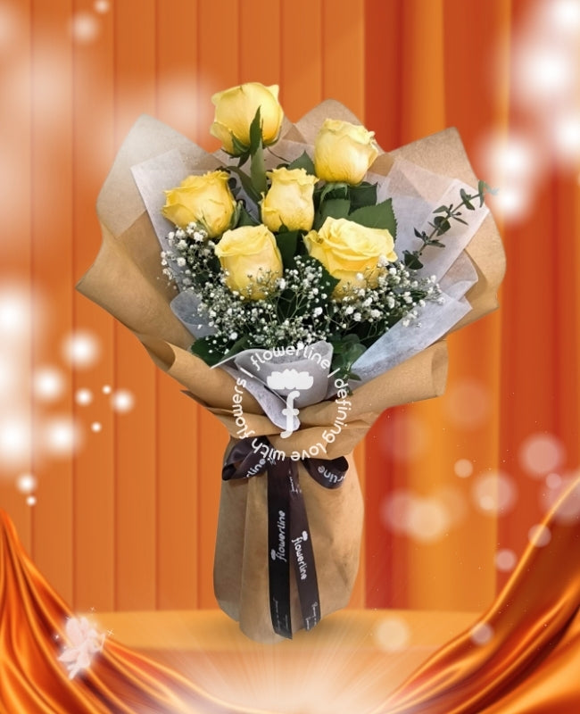 A bouquet with 6 stems of Bangkok Roses and fillers. The flowers are tied with nonwoven wrappers plus a satin ribbon.
