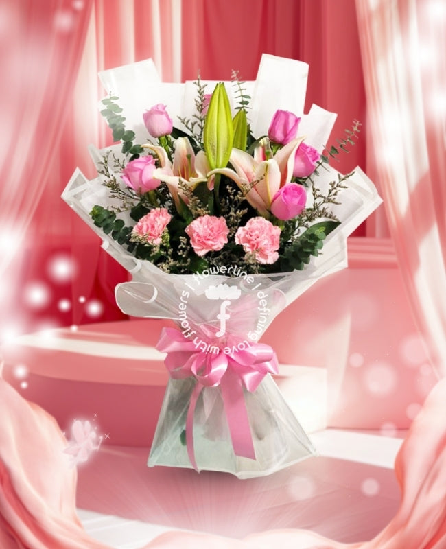 The bouquet comes with 1 stem of Lilies, 6 stems of Bangkok Roses, 3 stems of Carnations, and fillers. The flowers are tied with nonwoven and abaca wrappers plus a satin ribbon.