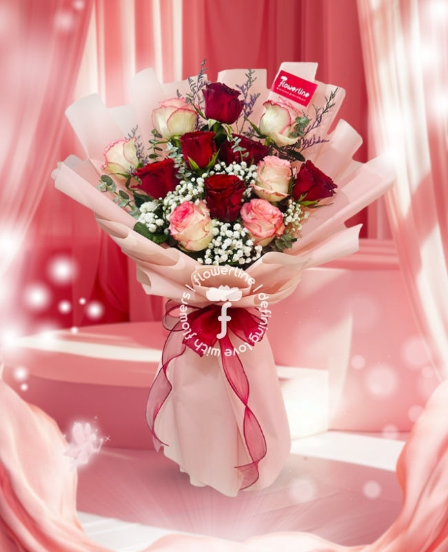 A bouquet with 1 dozen stems of Bangkok Roses and fillers. The flowers are tied with nonwoven and waterproof paper wrappers plus a satin ribbon.