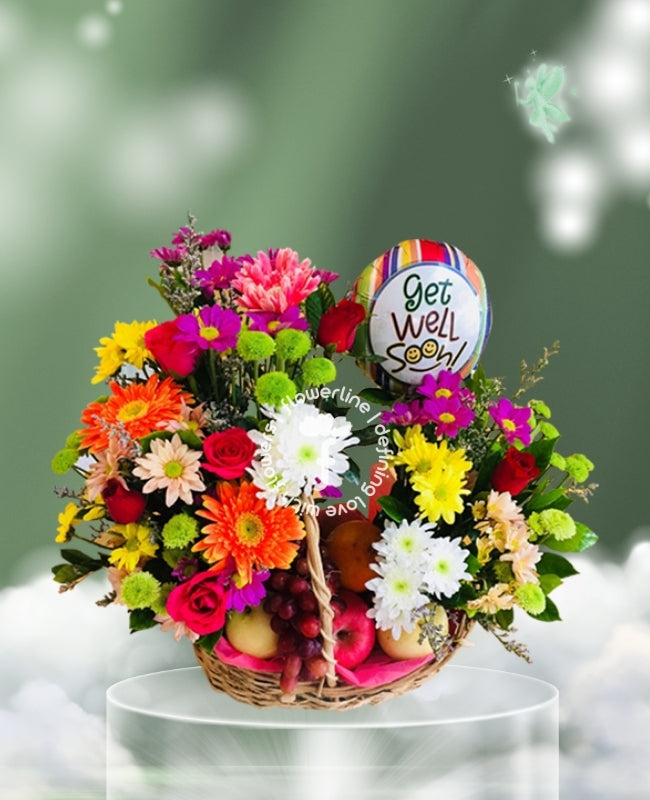 Our basket arrangement is composed of Mixed Fruits, Philippine Roses, Gerberas, Chrysanthemums and fillers.