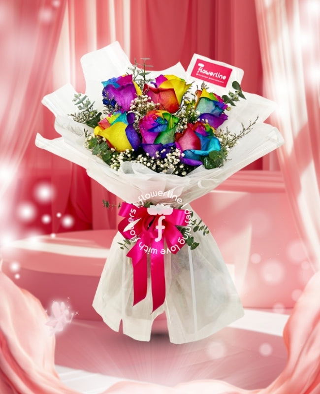 The bouquet comes with 6 stems of Rainbow Roses and fillers. The flowers are tied with abaca and burlap wrappers plus a ribbon.