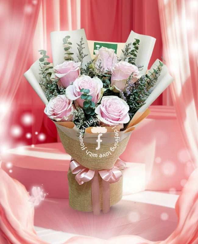 The bouquet comes with 6 stems of Ecuadorian Roses and fillers. The flowers are tied with nonwoven wrappers and a satin ribbon.
