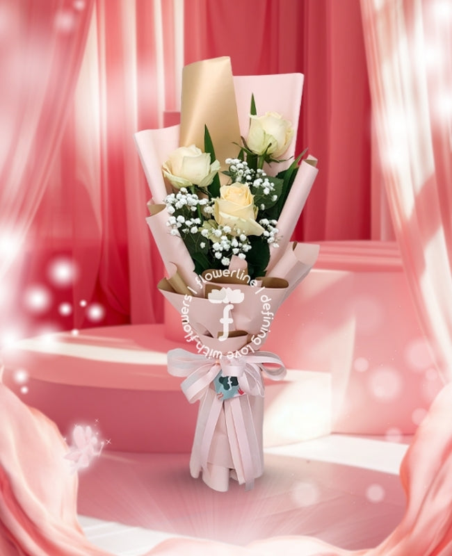 The bouquet comes with 3 stems of White Ecuadorian Roses and fillers. The flowers are tied with waterproof paper wrappers and satin ribbon.