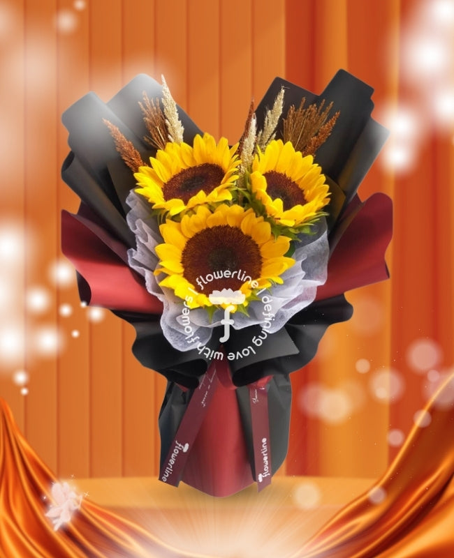 The bouquet comes with 3 stems of Sunflowers and fillers. The flowers are tied with nonwoven and waterproof wrappers plus ribbon.