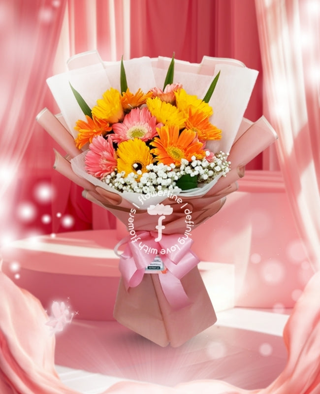 The bouquet comes with 1 dozen stems of colorful Gerberas and fillers. The flowers are tied with nonwoven and waterproof paper wrappers plus a satin ribbon.