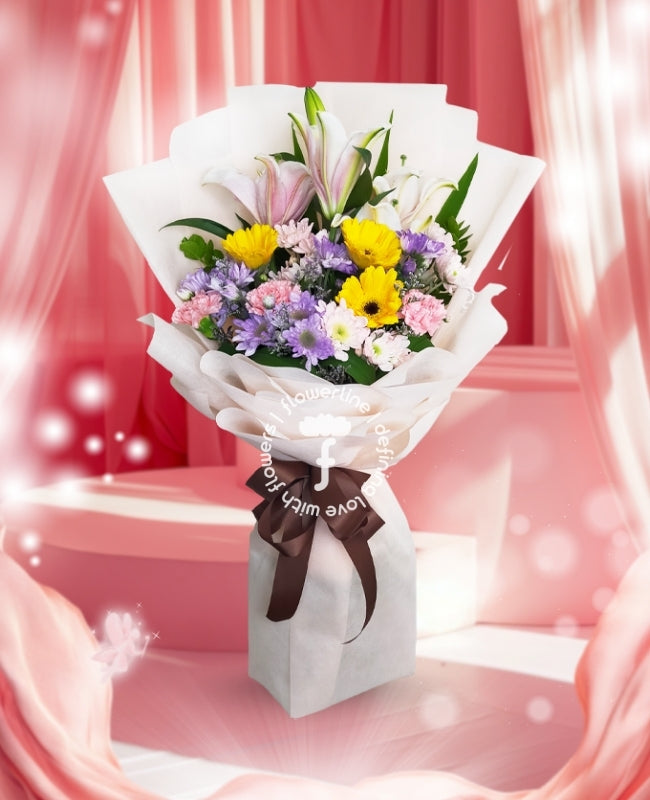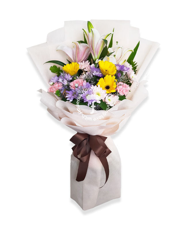 A beautifully crafted bouquet composed of Lilies, Gerberas, Carnations, Chrysanthemums and fillers. The flowers are tied with nonwoven wrappers plus ribbon.