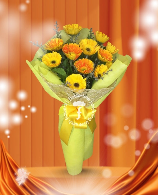 The bouquet comes with 1 dozen stems of Gerberas and fillers. The flowers are tied with nonwoven and abaca wrappers plus a satin ribbon.