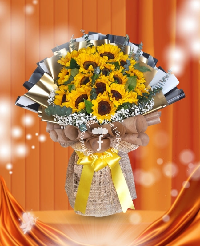 The bouquet comes with 18 stems of Sunflowers and fillers. The flowers are tied with burlap and waterproof paper wrapper plus a ribbon.