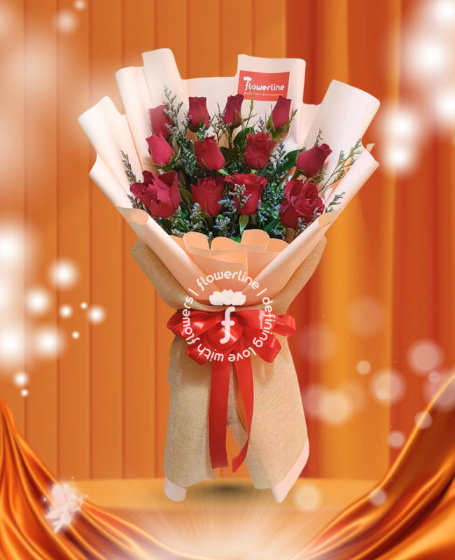 The bouquet comes with 1 dozen stems of Philippine Roses and fillers. The flowers are tied with nonwoven and burlap wrappers plus satin ribbon.