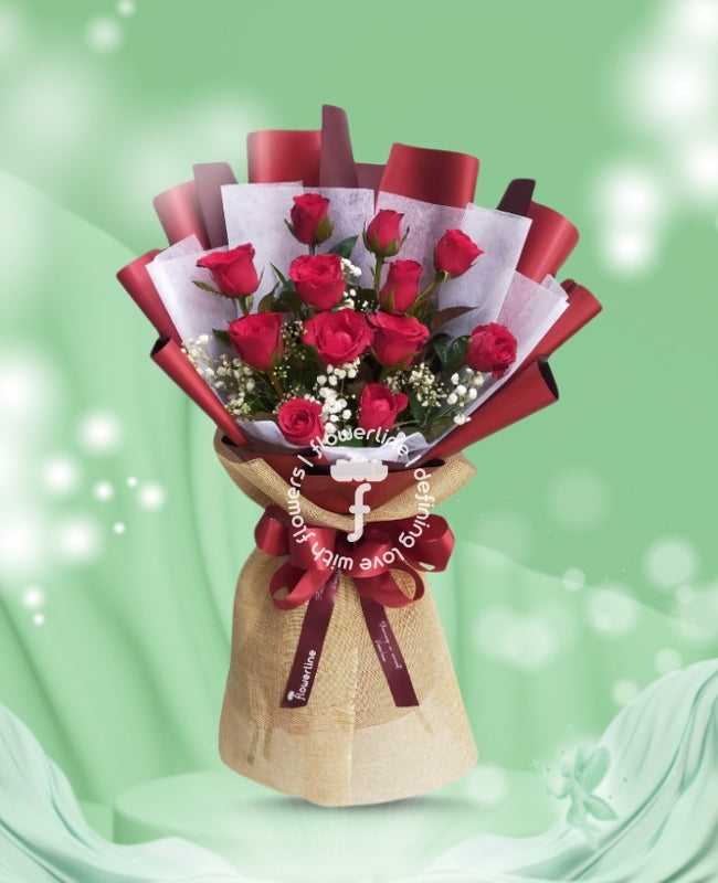 The bouquet comes with 1 dozen stems of Bangkok Roses and fillers. The flowers are tied with nonwoven and waterproof paper wrappers plus satin ribbon.