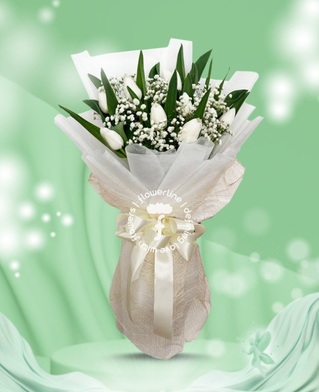 The bouquet comes with 1 dozen stems of Tulips and fillers. The flowers are tied with nonwoven and abaca wrappers plus a ribbon.