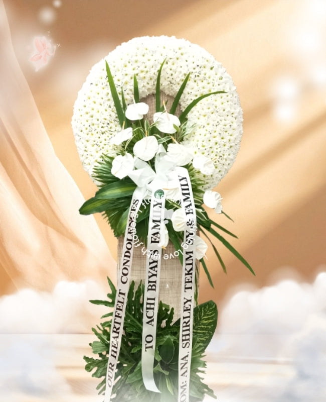 Express your sincerest condolences with this exquisite funeral flowers - wreath stand arrangement. Expertly crafted with the highest quality materials and attention to detail, this stunning flowers will be an elegant and tasteful tribute to the departed. Meticulous details and fine textures create a sophisticated and timeless representation of love and respect.