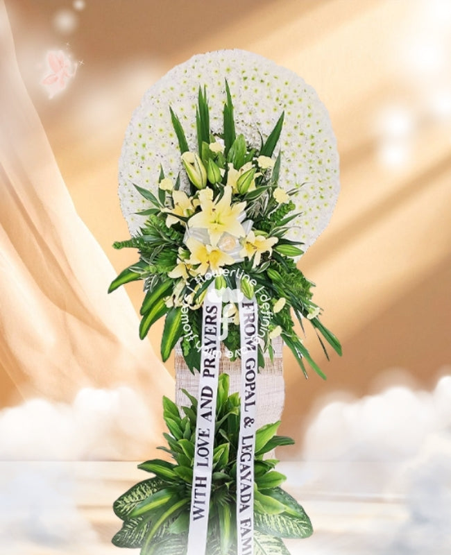 Express your sincerest condolences with this exquisite funeral flowers - wreath stand arrangement. Expertly crafted with the highest quality materials and attention to detail, this stunning flowers will be an elegant and tasteful tribute to the departed. Meticulous details and fine textures create a sophisticated and timeless representation of love and respect.