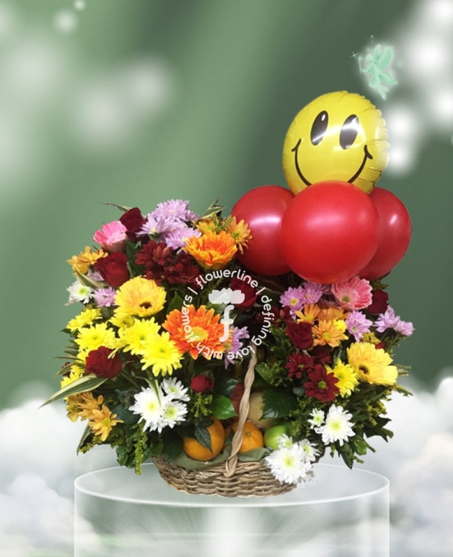 Our basket arrangement is composed of Balloons, Mixed Fruits, Gerberas, Chrysanthemums, and fillers.