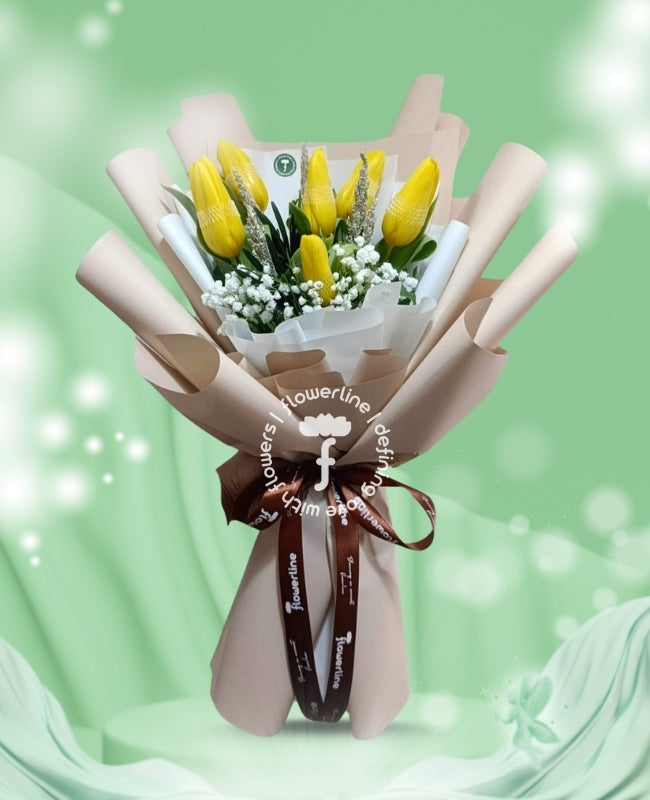 The bouquet comes with 6 stems of Tulips and fillers. The flowers are tied with kraft paper wrappers plus satin ribbon.