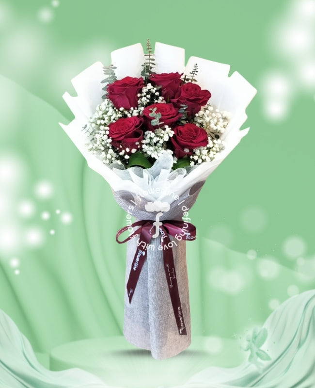 The bouquet comes with 6 stems of Ecuadorian Roses and fillers. The flowers are tied with nonwoven wrappers and a satin ribbon.